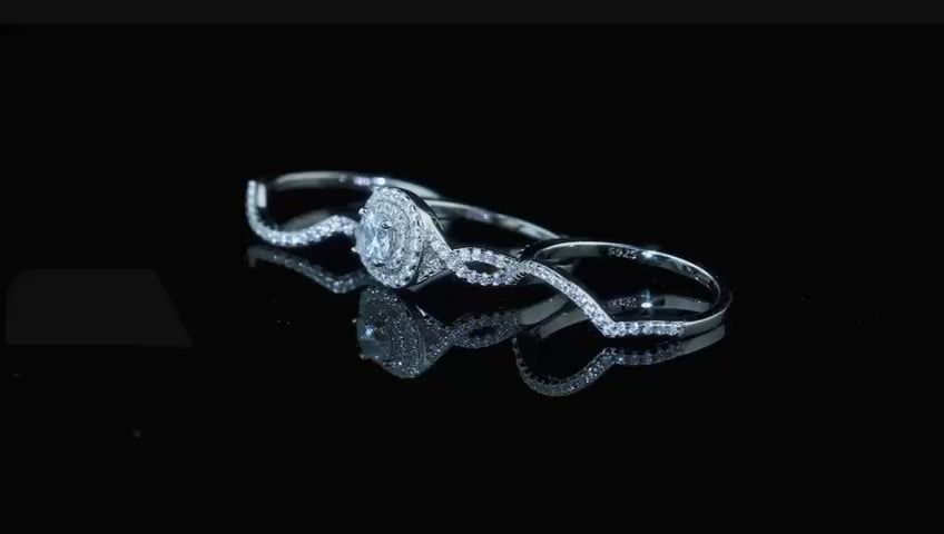 A sculptural composition of three stacking rings, designed to be worn together as a seamless statement of brilliance. The Éclat Trinity Ring Set is handcrafted in certified 925 sterling silver and finished with luminous rhodium plating. The centerpiece features a 0.5 ct round-cut moissanite, encircled by a double pavé halo of white zirconia. Two contour bands with micro pavé detailing complete the architectural silhouette.